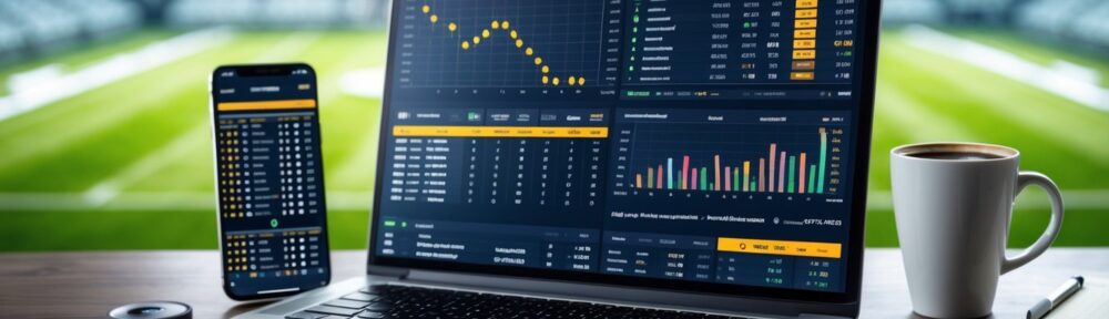 Meja kerja dengan laptop yang menampilkan statistik taruhan sepak bola handicap Asia, ponsel dengan skor pertandingan, dan latar belakang stadion sepak bola.